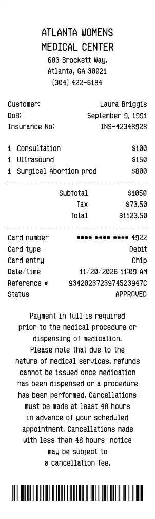 Make a professional Abortion Clinic receipt in minutes using our customizable receipt generator. Customize items, prices, taxes, and store details — then export a clean, high-quality receipt for records, bookkeeping, or customer documentation.