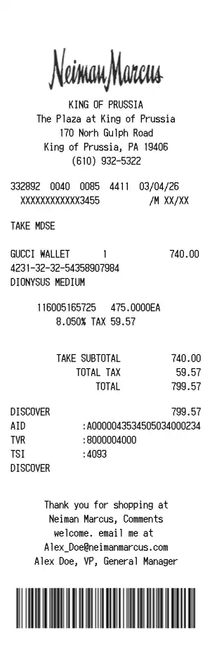 Make a professional Neiman Marcus receipt in minutes using our customizable receipt generator. Customize items, prices, taxes, and store details — then export a clean, high-quality receipt for records, bookkeeping, or customer documentation.