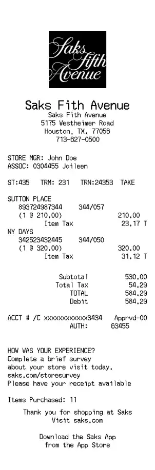 Make a professional Saks Fifth Avenue receipt in minutes using our customizable receipt generator. Customize items, prices, taxes, and store details — then export a clean, high-quality receipt for records, bookkeeping, or customer documentation.